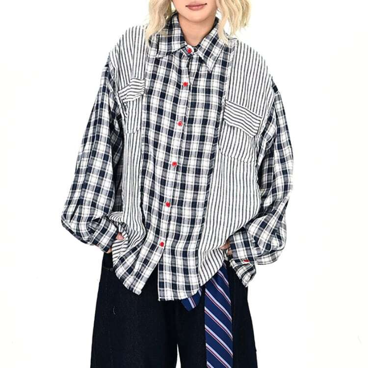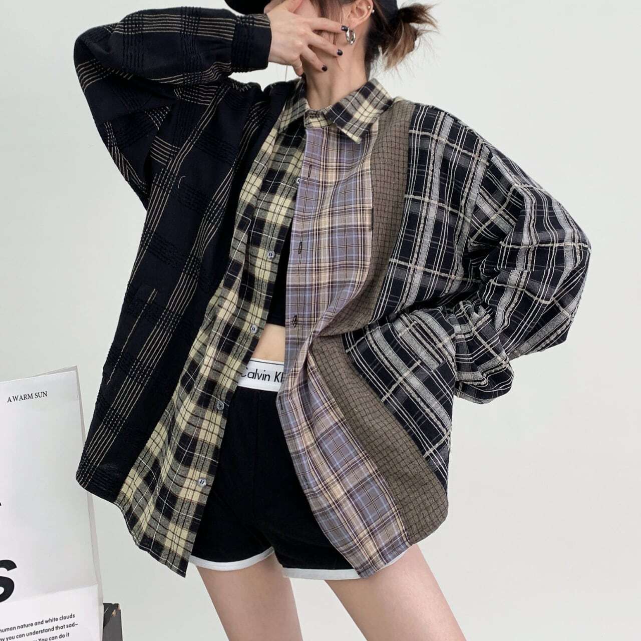 【patchwork check pattern oversized shirt パッチワークチェック柄オーバーサイズシャツ J0688】