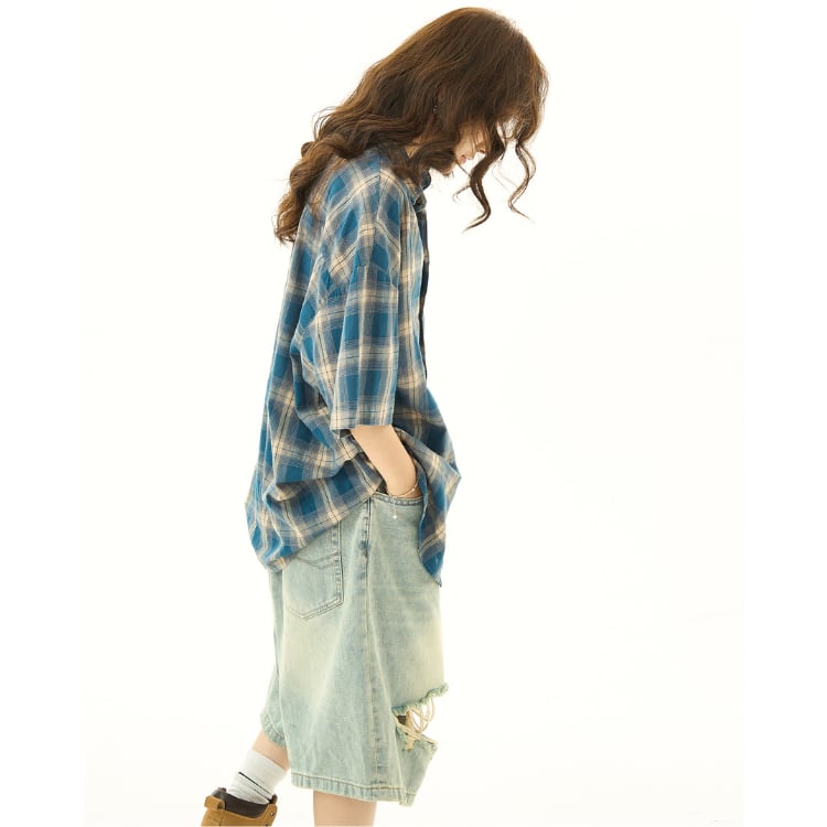 爽やかなブルーのチェック柄が可愛いレトロな半袖シャツ。