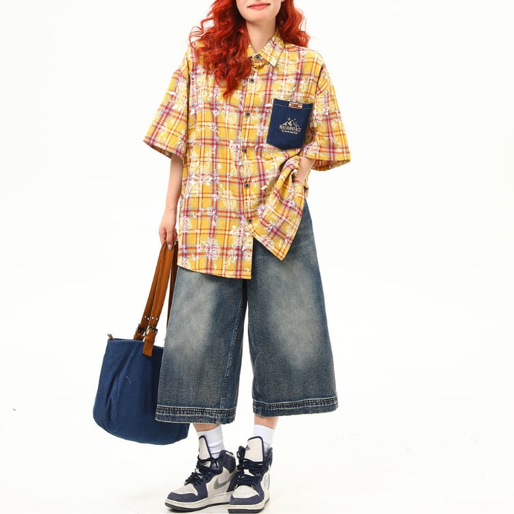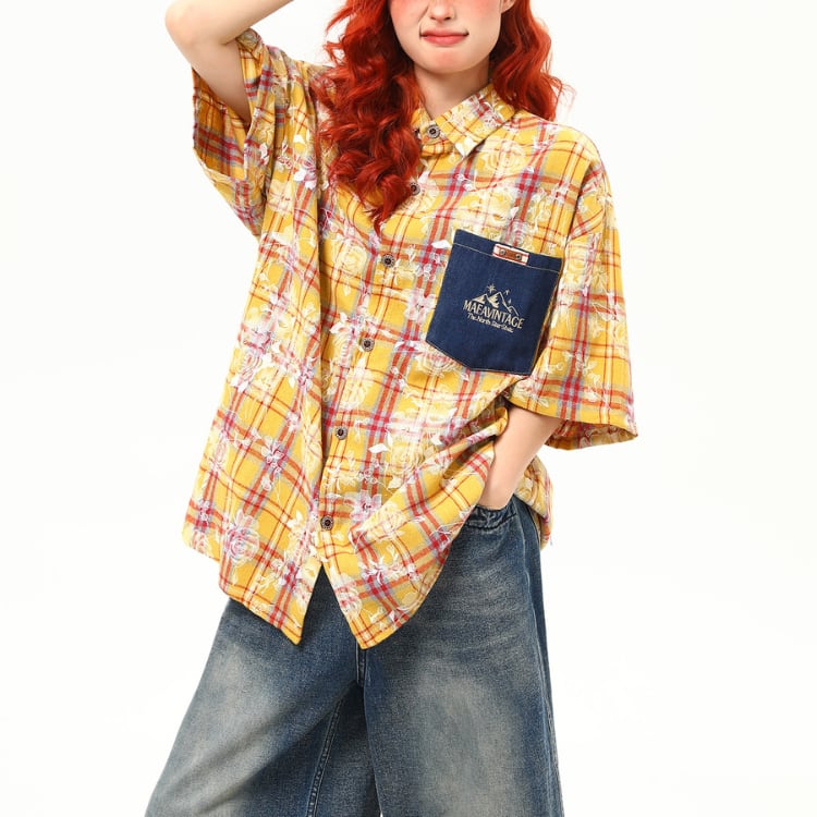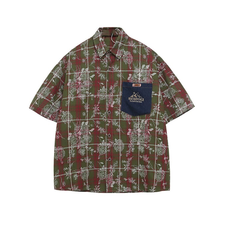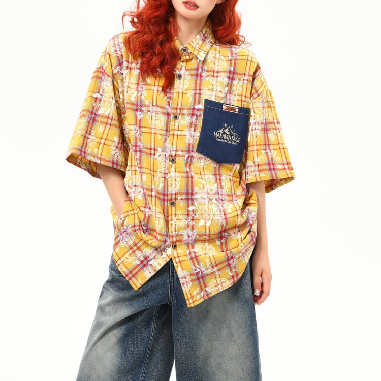 チェック柄とローズデザインの組み合わせが新鮮な半袖シャツ。