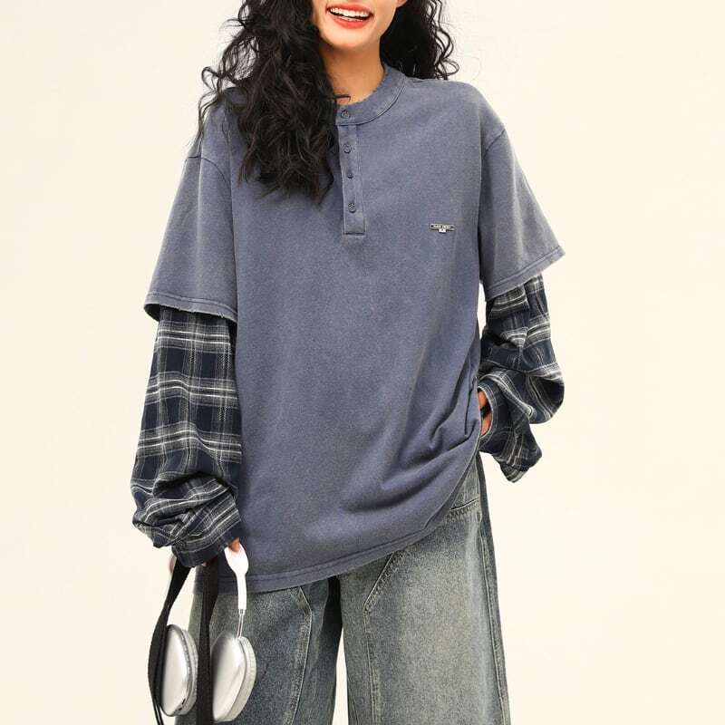 【henley neck fake two-piece long tee ヘンリーネックフェイクツーピースロングティー J1489】