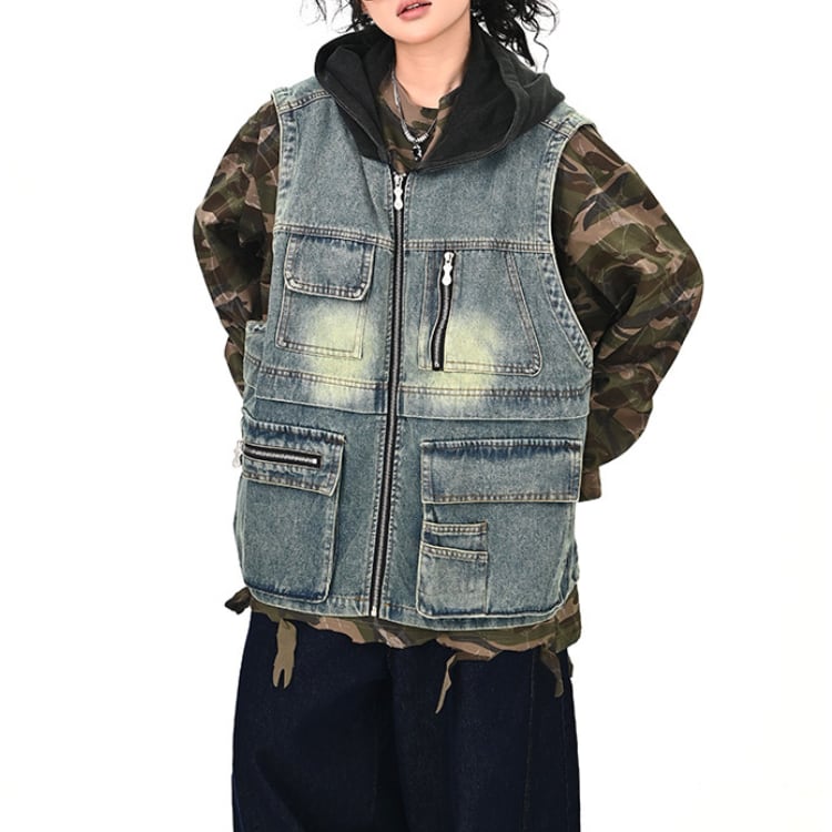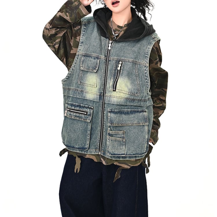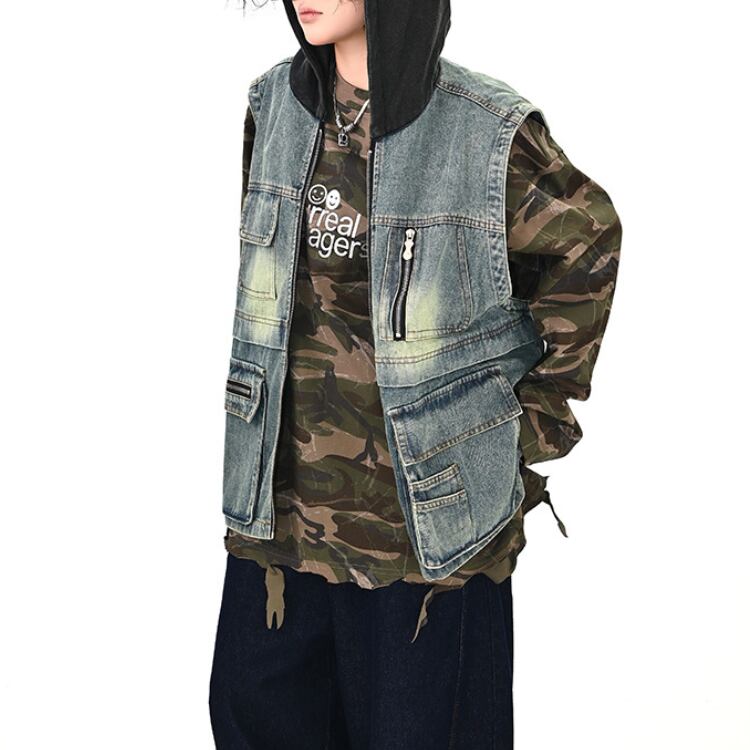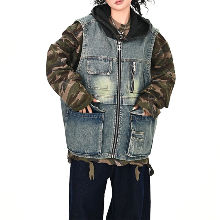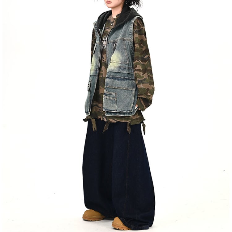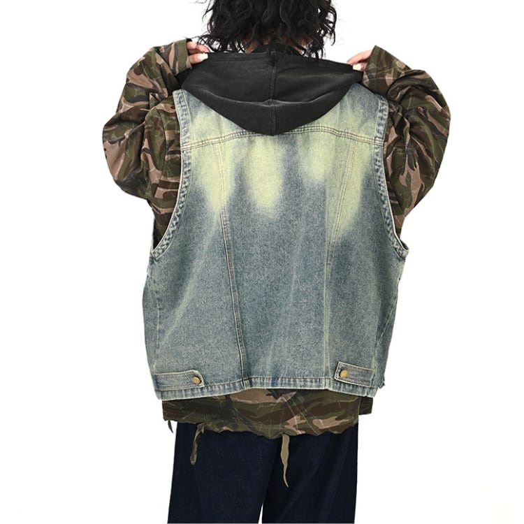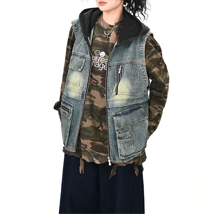 フード付きのデニムベストで、シンプルなスタイルも一気にアップデート。