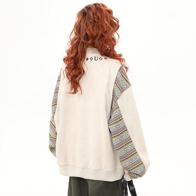 袖にあしらわれたエスニック調のデザインが、カジュアルなスタイルに個性と深みを与えます。