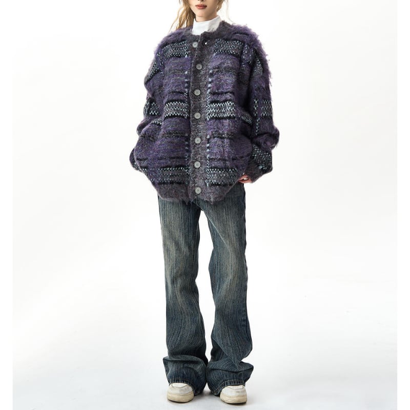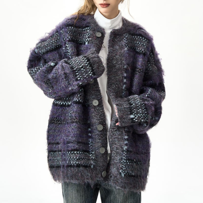 トレンド感満載のチェック柄が目を引く、デザイン性豊かなニットカーディガン。