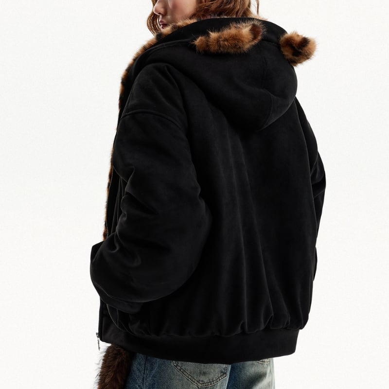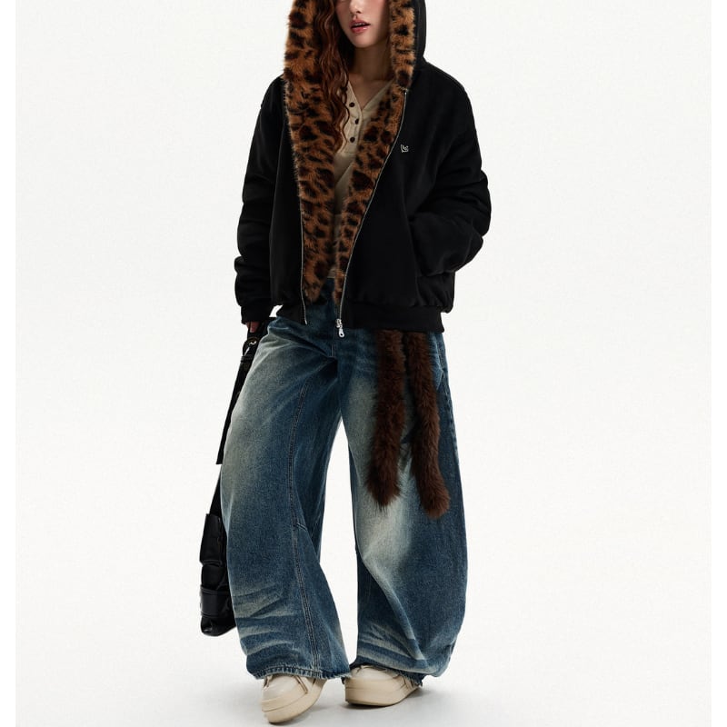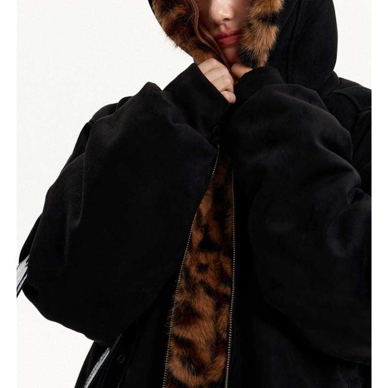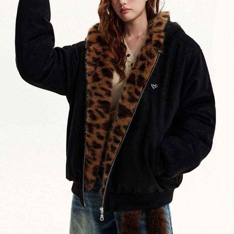 ふわふわのヒョウ柄ファーと、耳付きフードが主役級。