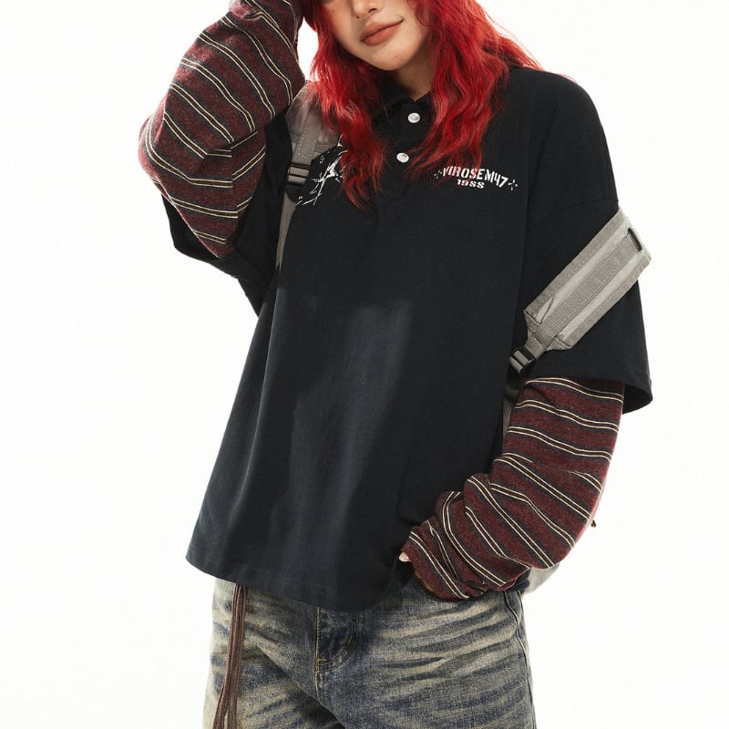 一枚でレイヤードスタイルが完成する、ボーダースリーブ切り替えポロTシャツ。