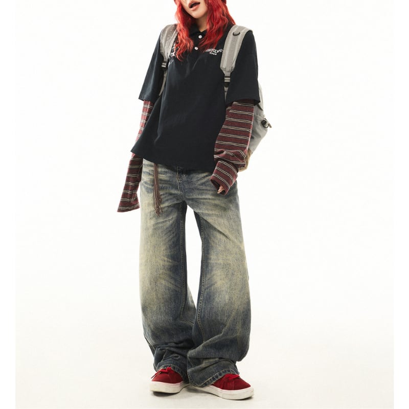 【layered style striped sleeve logo long tee レイヤード風ボーダースリーブロゴロングティー J1116】