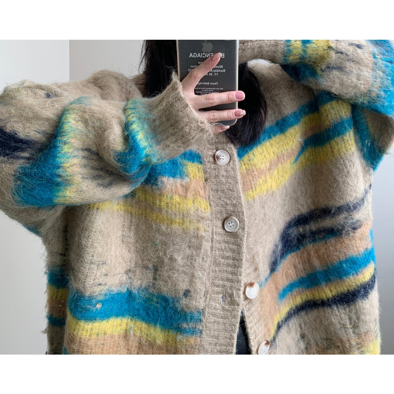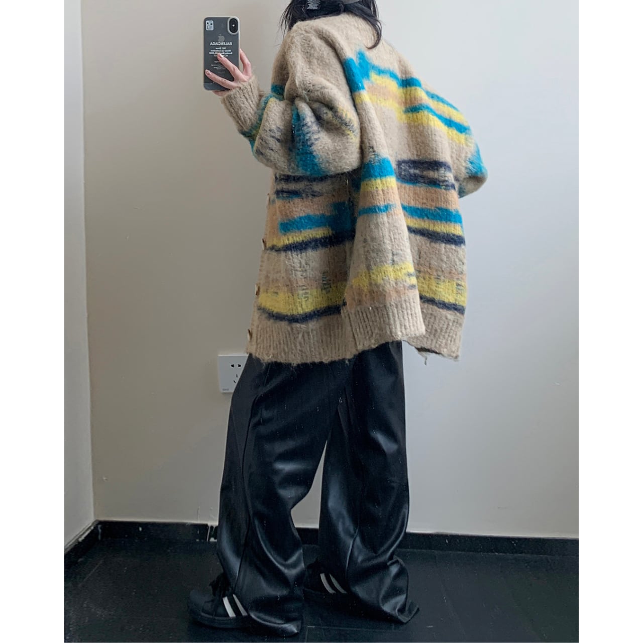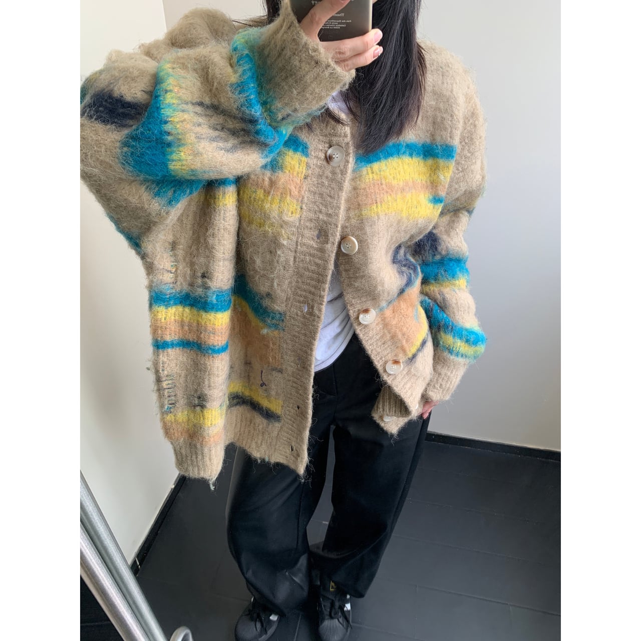 ゆったりとしたシルエットが魅力のマルチカラーシャギーニットカーディガン!