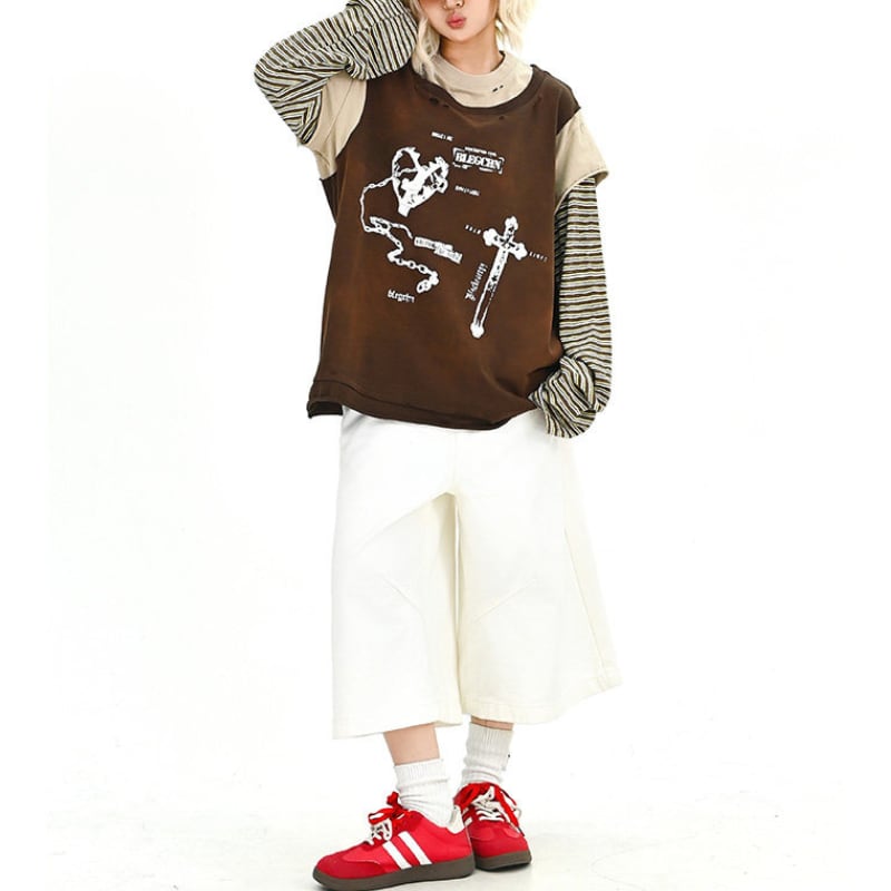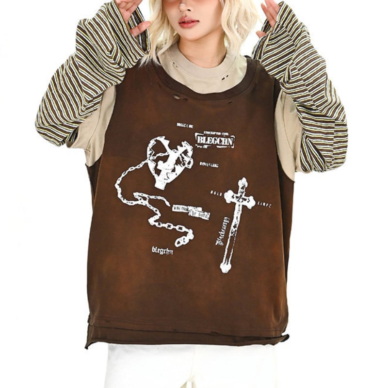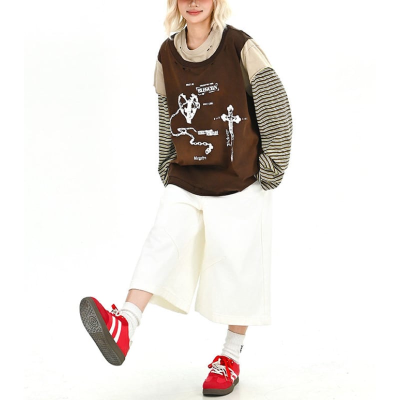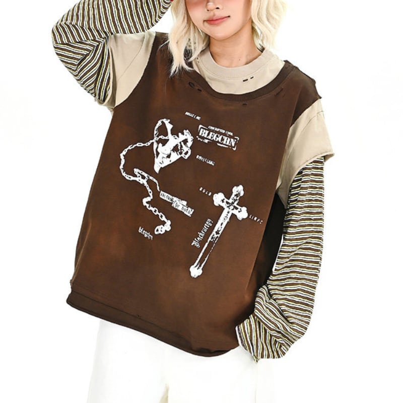 重ね着風デザインで一枚でも存在感。 グラフィックプリントにボーダースリーブを合わせたストリート感たっぷりのトップス。 【サイズ】 S 肩幅:46cm 胸囲:112cm 着丈:64cm 袖丈:60cm M 肩幅:47cm 胸囲:116cm 着丈:66cm 袖丈:61.5cm L 肩幅:48cm 胸囲:120cm 着丈:68cm 袖丈:63cm XL 肩幅:49cm 胸囲:124cm 着丈:70cm 袖丈:64.5cm ※採寸方法により1~3cmの誤差がある場合がございます 【カラー】 ブラウン 【素材】 綿 ✔ Shop top page https://shop.jemmener.com/ ✔ HOT ITEM https://shop.jemmener.com/categories/5960438 【お届けについて】 こちらの商品は海外店舗より直接発送となる為、 ご決済から発送まで1~3週間前後のお時間をいただいております。 (※商品の状況によっては、3週間以上かかる場合もございます。 その際は、メールにてご連絡させていただきます。) ◼️注意事項 ・タイミングによっては 商品在庫切れにより 注文キャンセルとさせていただく恐れもございますので、 予めご了承くださいませ。 ・こちらは輸入品となります。 日本製とは検品基準が異なる為、新品未使用品でも ごくわずかな汚れや傷がある場合もございます。 ・商品の色味は、お手持ちのデバイスの 環境設定により実物と若干異なる場合がございます。 ・イメージ違いやサイズ等、お客様都合による交換、 返品、キャンセルは対応出来かねます。 ———————————— ご購入前にこちらをお読みください →https://shop.jemmener.com/about ————————————