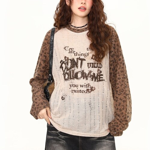 【leopard sleeve crushed design long tee レオパードスリーブクラッシュデザインロングティー J1733】