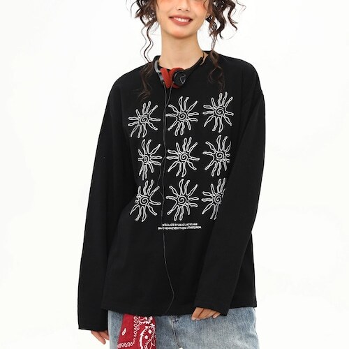 【unique flower black long tee ユニークフラワーブラックロングティー J1542】